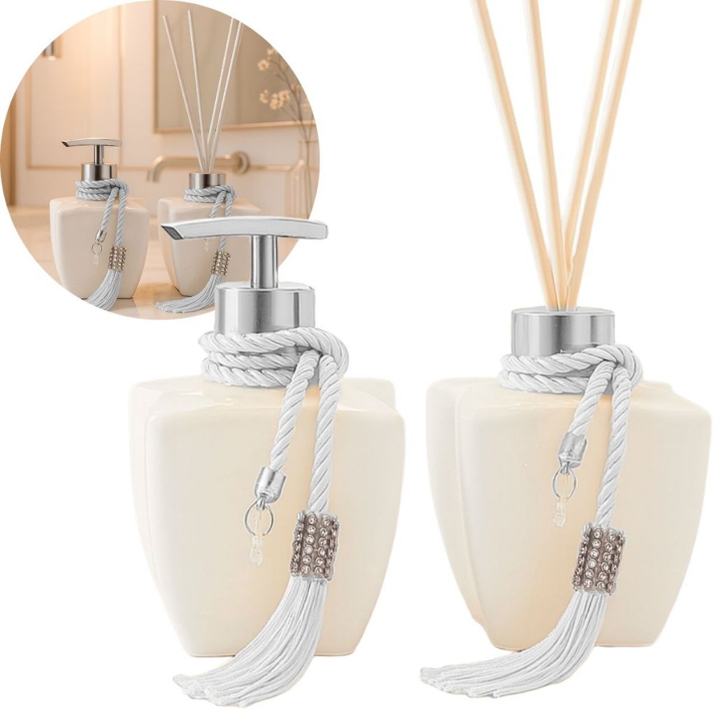 Função dupla: um frasco difusor de aromas e outro para sabonete líquido – praticidade com estilo.